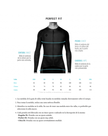 Mangas de ajuste perfecto, para no penalizar la aerodinámica. Puño diseñado para introducirse fácilmente en unos guantes largos.