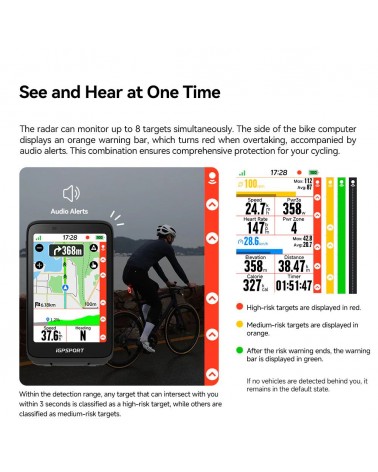 Este radar para ciclismo puede monitorizar hasta 8 objetivos a la vez, mostrando en el lateral del ciclocomputador una barra de advertencia que pasa de naranja a roja cuando un vehículo adelanta, además de alertas de audio. Esta combinación mejora la percepción del entorno y aporta una protección más completa durante la ruta.