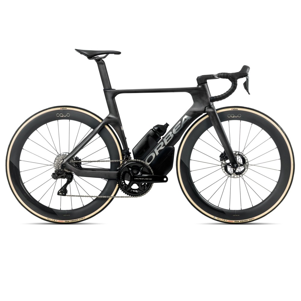 - Cuadro: Orbea Orca Aero Carbon OMX Disc, construcción monocasco, HS 1.5", BB386, compatible con potenciómetro, eje pasante trasero 12x142 mm (rosca M12x2 P1), Speed Release, guiado interno de cables, compatible EC/DC