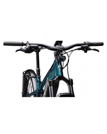 - Cuadro: E5 Aluminum, doble suspensión, estilo mullet (M–XL), soporte motor en eje de pedalier, batería integrada y bloqueable en tubo diagonal, guiado interno de cables, anclajes para candado y portabultos delantero